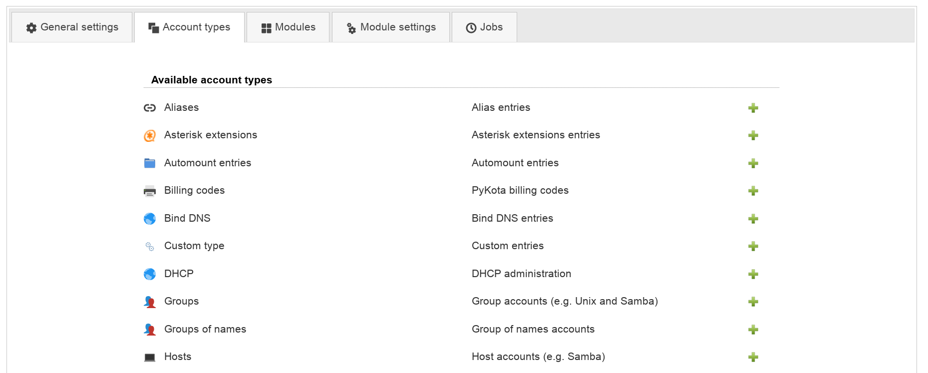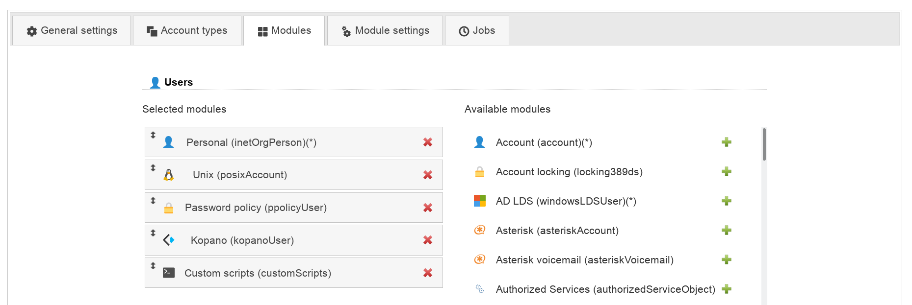 Furthermore, there may be any number of additional active account modules. E.g. you may select "Personal" as base module and Unix + Samba as additional modules.