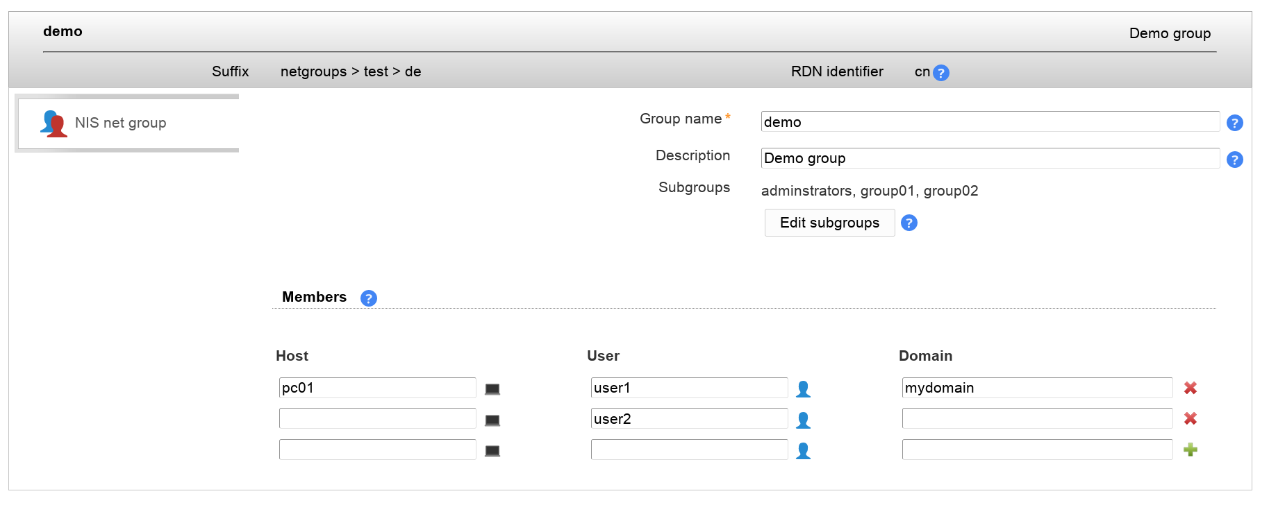 Add the NIS net group account type and its module to your server profile. Then you can manage net groups in LAM. Net groups may contain other net groups as child groups. You can either insert the host/user names manually or print the search buttons next to the input fields to find existing entries in your directory.